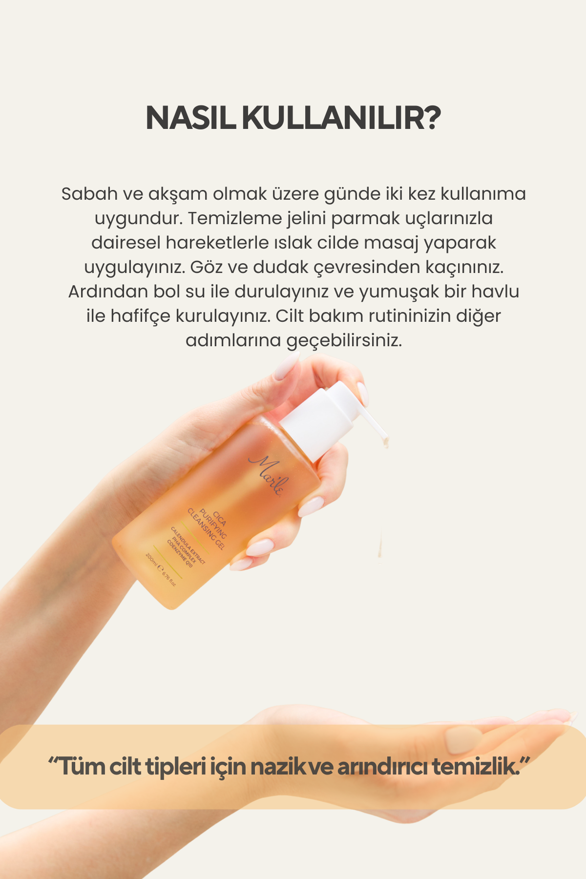 Sabah ve akşam olmak üzere günde iki kez kullanıma uygundur. Temizleme jelini parmak uçlarınızla dairesel hareketlerle ıslak cilde masaj yaparak uygulayınız. Göz ve dudak çevresinden kaçınınız. Ardından bol su ile durulayınız ve yumuşak bir havlu ile hafifçe kurulayınız. Cilt bakım rutininizin diğer adımlarına geçebilirsiniz.