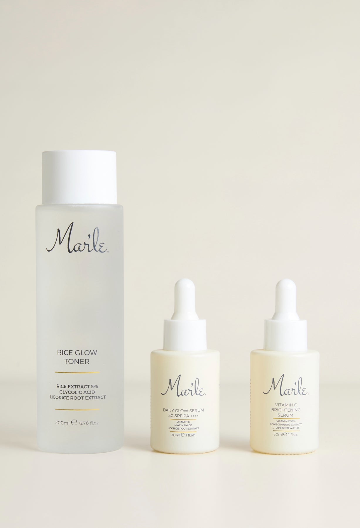 Mar’le Işıltı Üçlüsü, cildinize aydınlık kazandırmak, tonu eşitlemek ve gün boyu korumak için özel olarak tasarlandı. Pirinç özü ve glikolik asit içeren Rice Glow Toner, cildi nazikçe arındırarak bakım için hazırlar. Vitamin C Brightening Serum, cilde parlaklık ve canlılık verirken, Daily Glow Serum SPF 50 formülü sayesinde cildinizi güneşin zararlı etkilerine karşı korur. Bu üçlü rutin, sabah ve akşam uygulanarak cildinize hem anında ışıltı hem de uzun vadede daha pürüzsüz ve sağlıklı bir görünüm kazandırır.