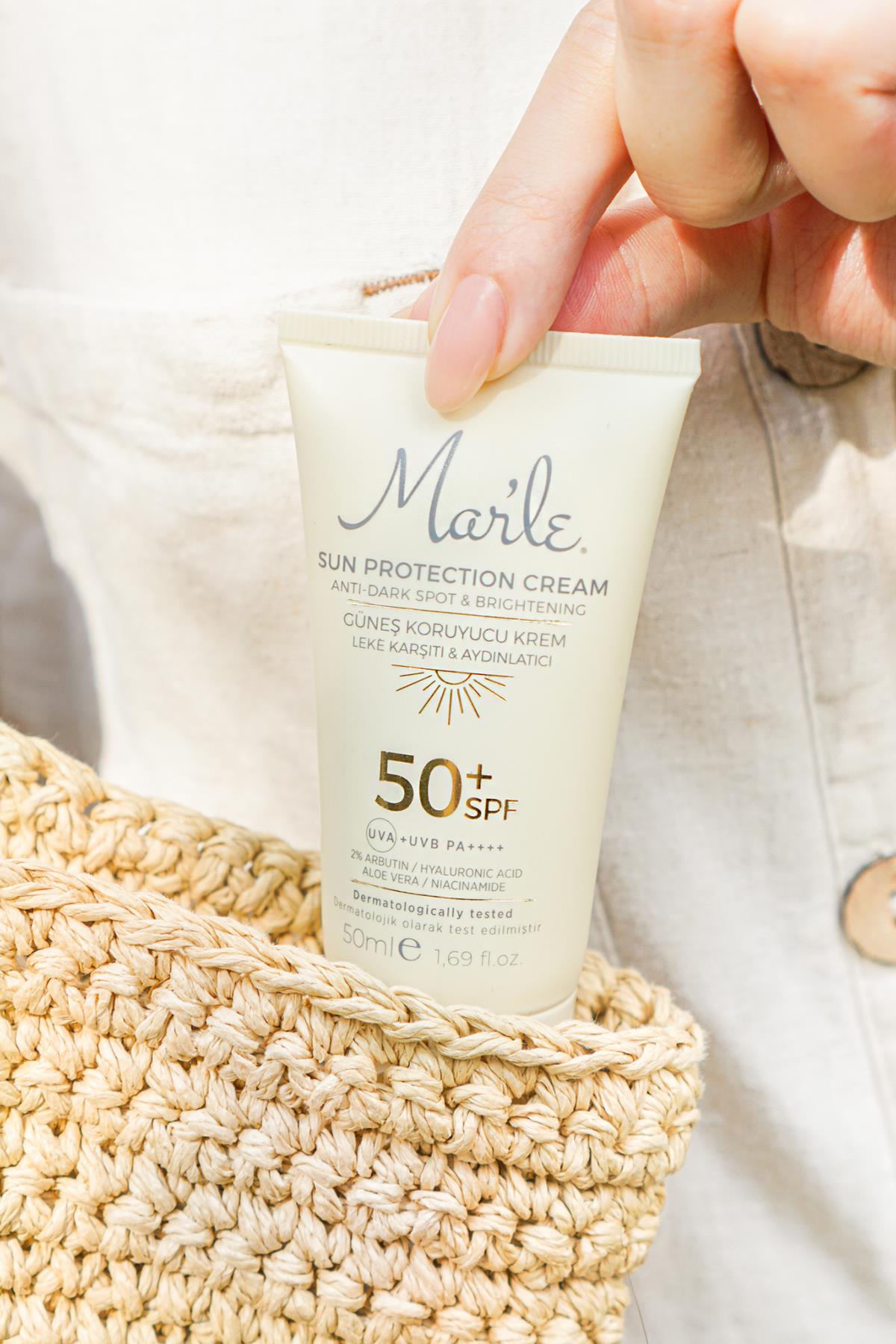 Mar’le Leke Karşıtı Güneş Kremi 50+ SPF, PA++++, güneşin zararlı UVA ve UVB ışınlarına karşı yüksek koruma sağlarken, içeriğindeki güçlü aktif bileşenlerle cildinize bakım yapar ve leke oluşumunu önlemeye yardımcı olur. Hafif ve hızlı emilen formülü sayesinde günlük kullanıma uygundur, ciltte beyaz iz bırakmaz ve yağlı his oluşturmaz. İçeriğindeki %2 arbutin, cilt tonu eşitsizliklerini gidermeye ve yeni leke oluşumunu engellemeye yardımcı olur. Hyaluronik asit yoğun nem sağlayarak cildi derinlemesine nemlendirir ve ince kırışıklıkların görünümünü azaltır. Niacinamide, gözenekleri sıkılaştırarak daha parlak ve pürüzsüz bir cilt görünümü sunarken, aloe vera ve panthenol cildi yatıştırır, besler ve yeniler. Gün boyu güçlü koruma ve cilt bakımını bir arada sunan bu özel formül, lekelerin azalmasına yardımcı olurken cildinize ışıltı kazandırır.