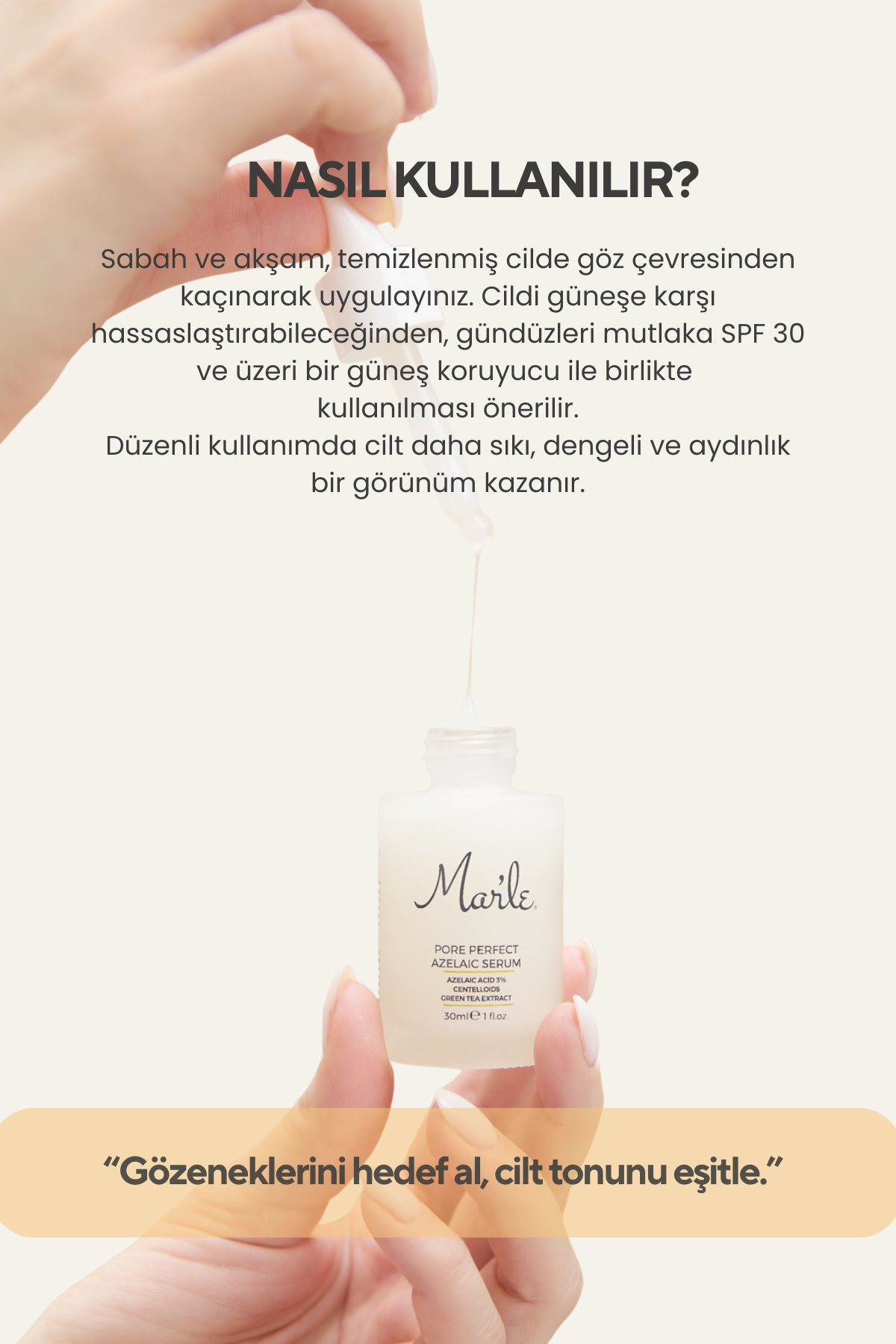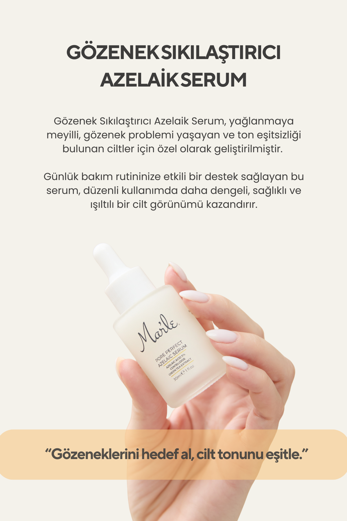 Gözenek Sıkılaştırıcı Azelaik Serum, yağlanmaya meyilli, gözenek problemi yaşayan ve ton eşitsizliği bulunan ciltler için özel olarak geliştirilmiştir. Formülündeki Azelaik Asit, gözenekleri hedef alır, cilt yüzeyini pürüzsüzleştirir ve ton eşitsizliklerini azaltarak cildin aydınlık bir görünüm kazanmasına yardımcı olur. Centelloidler (Madecassic Acid, Asiatic Acid, Asiaticoside), cilt bariyerini güçlendirir, kızarıklıkları yatıştırır ve hassas ciltleri rahatlatır. Beta-Glukan ve Hyaluronik Asit, cildi derinlemesine nemlendirirken; Yeşil Çay Özü, güçlü antioksidan etkisiyle serbest radikallere karşı koruma sunar.